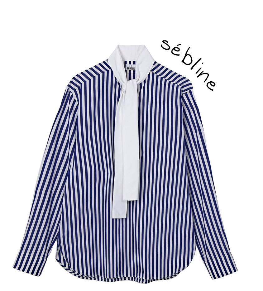 シャルル・セブリンが設立したシャツブランド「セブリン」。ボリュームのあるボウタイとシャープなストライプのコントラストが小粋。