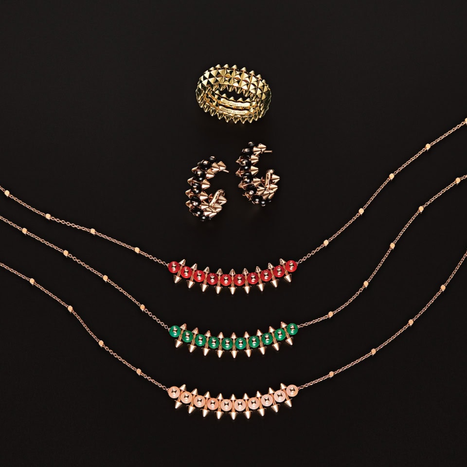 ピコ(スタッズ)、ビーズ、クル ドゥ パリ(四角錐)というカルティエの伝統的モチーフを幾何学的に“衝突(クラッシュ)”させたこのシリーズは、パンキッシュな鋭さと肌にしなやかに沿うエレガントな柔らかさが共存する唯一無二の存在。そこにレッドアゲート、グリーンアゲート、ピンクカルセドニー、オニキスが加わって、より鮮やかな表情に。既存のゴールドモデルの約2倍というパーツ数が生む圧倒的な緻密さにも注目。
