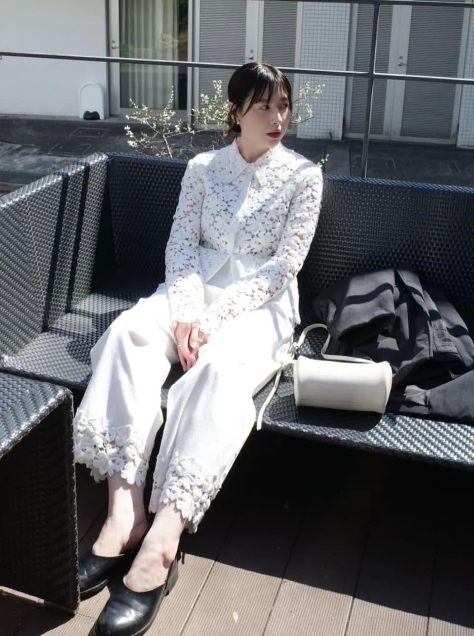 着るだけで華やかに決まる、立体的なフラワーレースをあしらったセットアップ。レースの甘さは活かしながらも、ボトムはパンツだから程よくカジュアルに大人っぽくまとまる。足元はラフなブラックのシューズでヌケ感を。