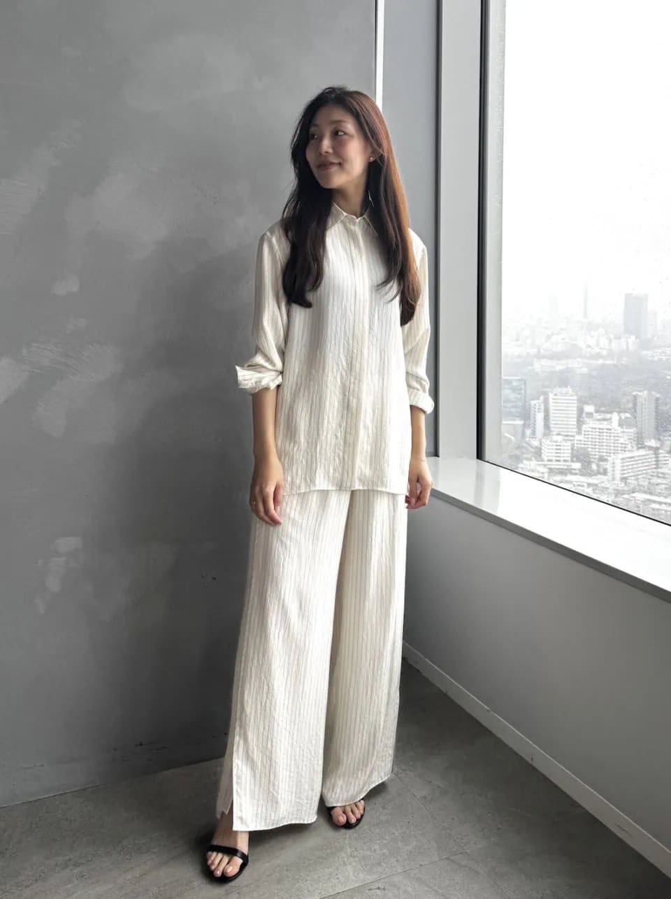 とろみのある素材感とゆったりとしたシルエットがリラックスムード満点のセットアップは、さり気なく入ったピンストライプがきちんと感もしっかり演出。華奢なヒールサンダルを合わせて大人のきちんと感をキープするのが正解。