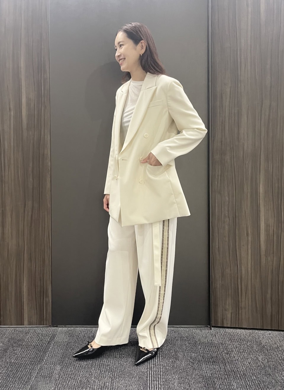 真っ白なホワイトよりも取り入れやすいのが、こんなエクリュがかった色。優しい印象を保ちながらも、かっちりとしたテーラードジャケットのシルエットや、ライン入りパンツのシャープなラインがコーデをスッキリと見せてくれる。