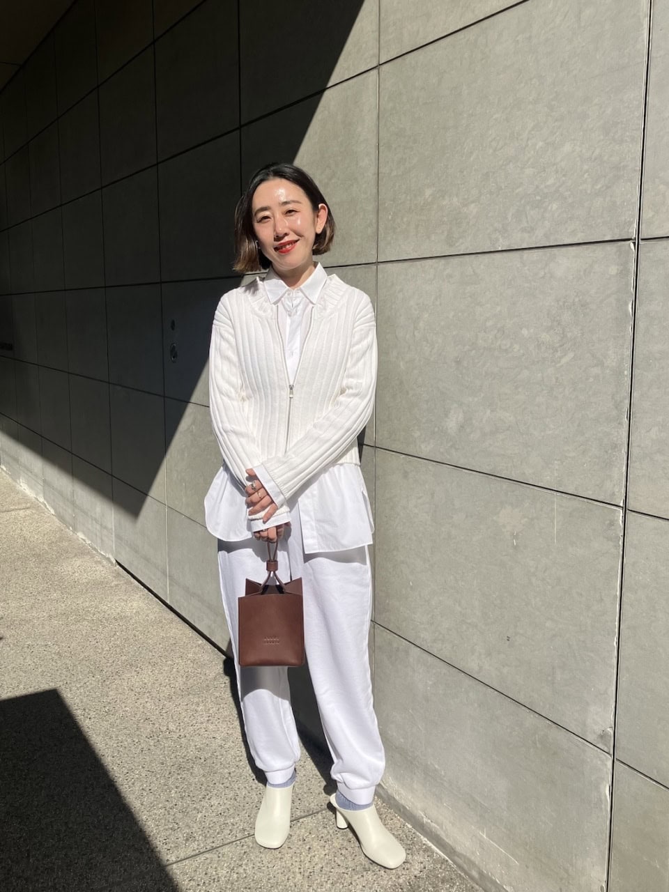 ニット、シャツ、スエットパンツ、レザーシューズと異なる素材のホワイトを上手に掛け合わせているので、のっぺり感は皆無。ポイントに1点投入したブラウンのバッグが洒落感を一層加速させる。