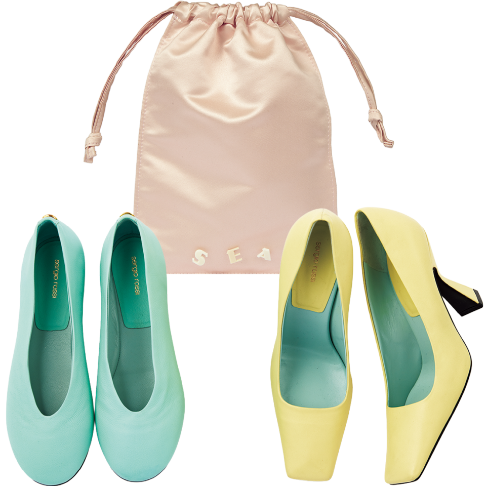 ピンクサテン巾着[H27×W21㎝]¥13,200(シー/エスストア)、イエローパンプス[ヒール6㎝]¥135,300、ライトブルーバレエシューズ[ヒール0.5㎝]¥115,500(共にセルジオ ロッシ/セルジオ ロッシ ジャパン カスタマーサービス)