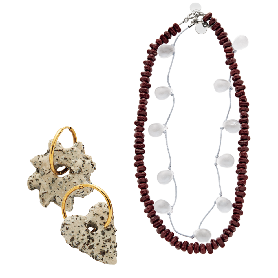 右:外側からブラウンガラスネックレス¥17,600、クリアガラスネックレス¥16,500(共にシシジョイア)、左:イヤリング¥24,200(レヴェンス ジュエルズ/全てギャルリー・ヴィー 丸の内店)