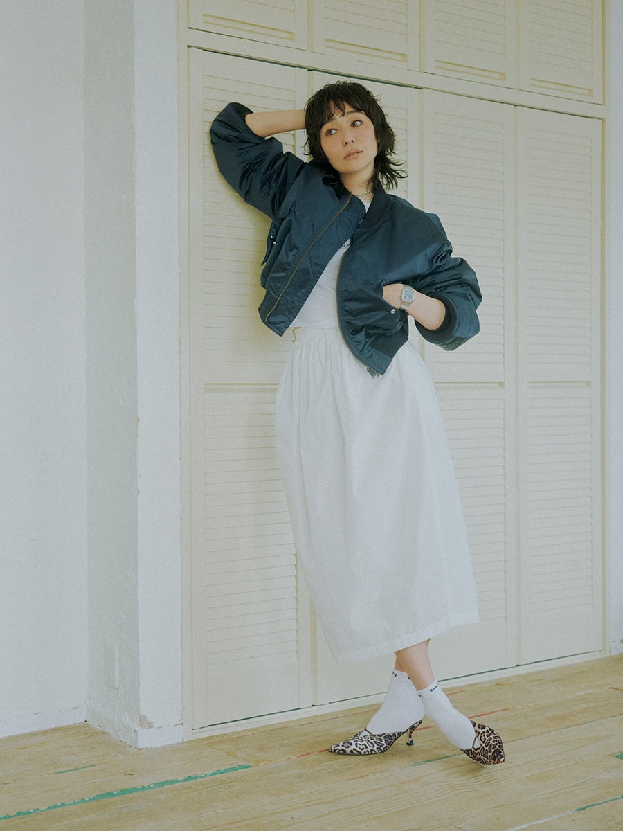 スカート※4月末発売予定¥27,500(ツル バイ マリコオイカワ)、ブルゾン¥47,300(ロク/ROKU 青山)、Tシャツ¥14,300※参考価格(スポーティー&リッチ/ザ・ウォール ショールーム)、ネックレス¥242,000(ソフィー ブハイ/エスケーパーズ アナザーワールド)、時計¥8,800(カシオ クラシック/カシオ計算機 お客様相談室)、ソックス¥3,850(SEA/エスストア)、ミュール¥35,200(ペリーコ サニー/アマン)