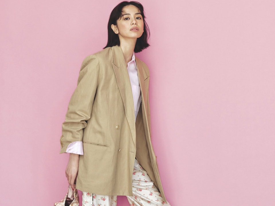ジャケット¥134,200(バウト)、シャツ¥66,000(マディソンブルー)、花柄パンツ¥138,600(ラ プレスティック ウィストン/サロン アダム エ ロペ)、サンダル¥156,200(ジャンヴィト ロッシ/ジャンヴィト ロッシ ジャパン)、バッグ¥17,600(ヴィスク/S&T)