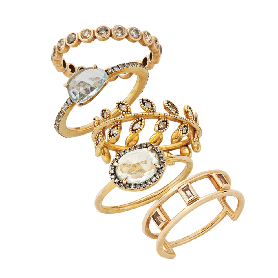 上から:リング[K10YG×DIA]¥154,000、リング[SV×K18YGP×トパーズ×DIA]¥45,100、リング[SV×K18YGP×DIA]¥46,200、リング[SV×K18YGP×アクアマリン×DIA]¥29,700(全てアルティーダ ウード)、リング[K10YG×クォーツ]¥66,000(4℃/エフ・ディ・シィ・プロダクツ)