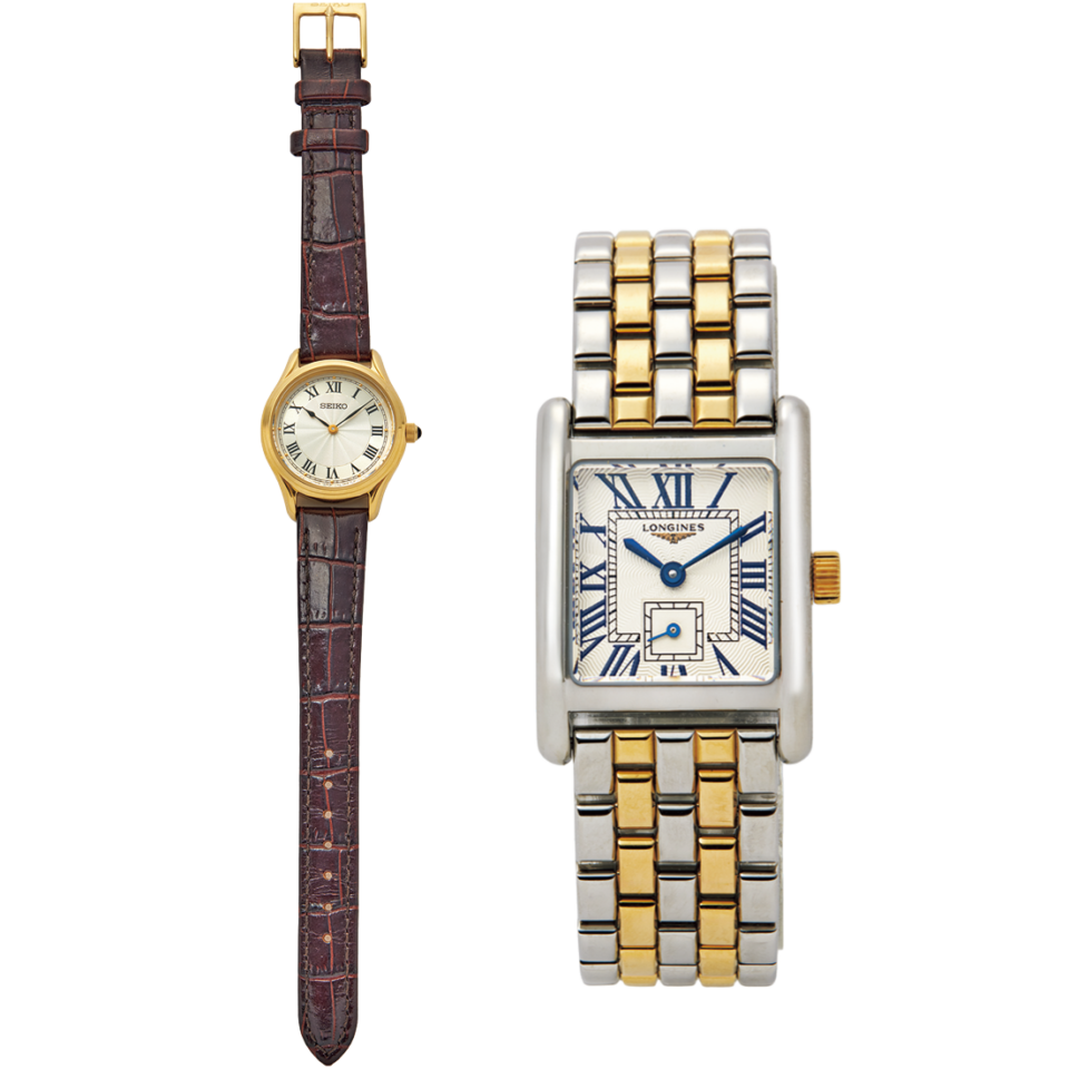 左:時計[ハードレックス×皮革(カーフ)]¥25,300(セイコーセレクション/セイコーウオッチお客様相談室)、時計右:[ステンレスティール×K18YG製キャップ]¥810,700(ロンジン/スウォッチ グループ ジャパン)