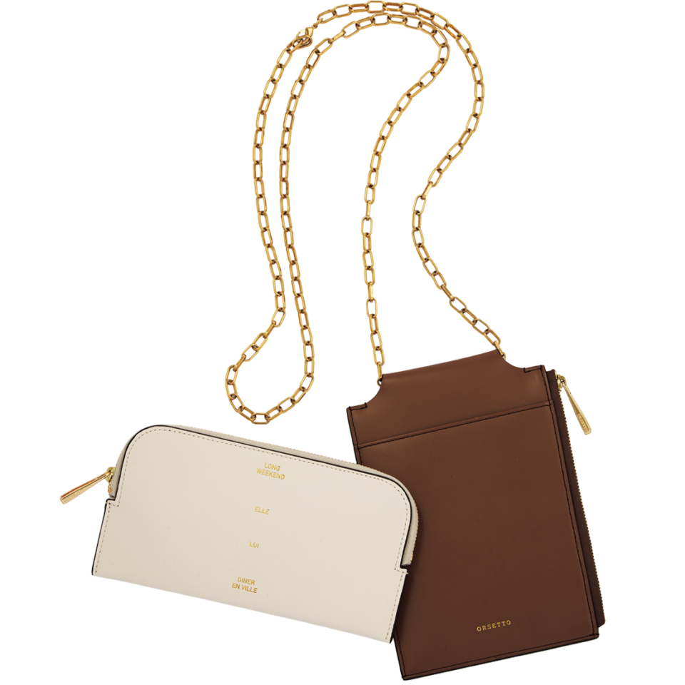 左:フラグメントケース[H8.5×W15.5㎝]¥19,800、右:チェーン付きフラグメントケース[H18×W12㎝]¥26,400(共にオルセット/オルサ)