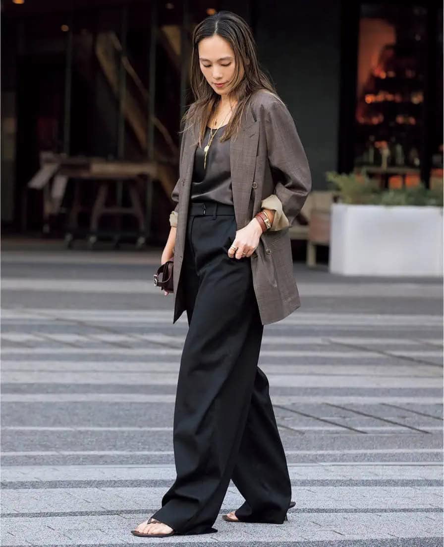 第4位はおしゃれミューズたちのスナップ特集より、AP STUDIOのバイヤー、大室有生さんの私服スタイルがランクイン。ダブルのジャケットと太めパンツという一見メンズライクな組み合わせに、光沢が美しいサテンのキャミソールを差して、女性らしいムードをプラス。全体的にキレイにまとめながらも足元はカジュアルなトングでハズしているのも洒落見えポイント。