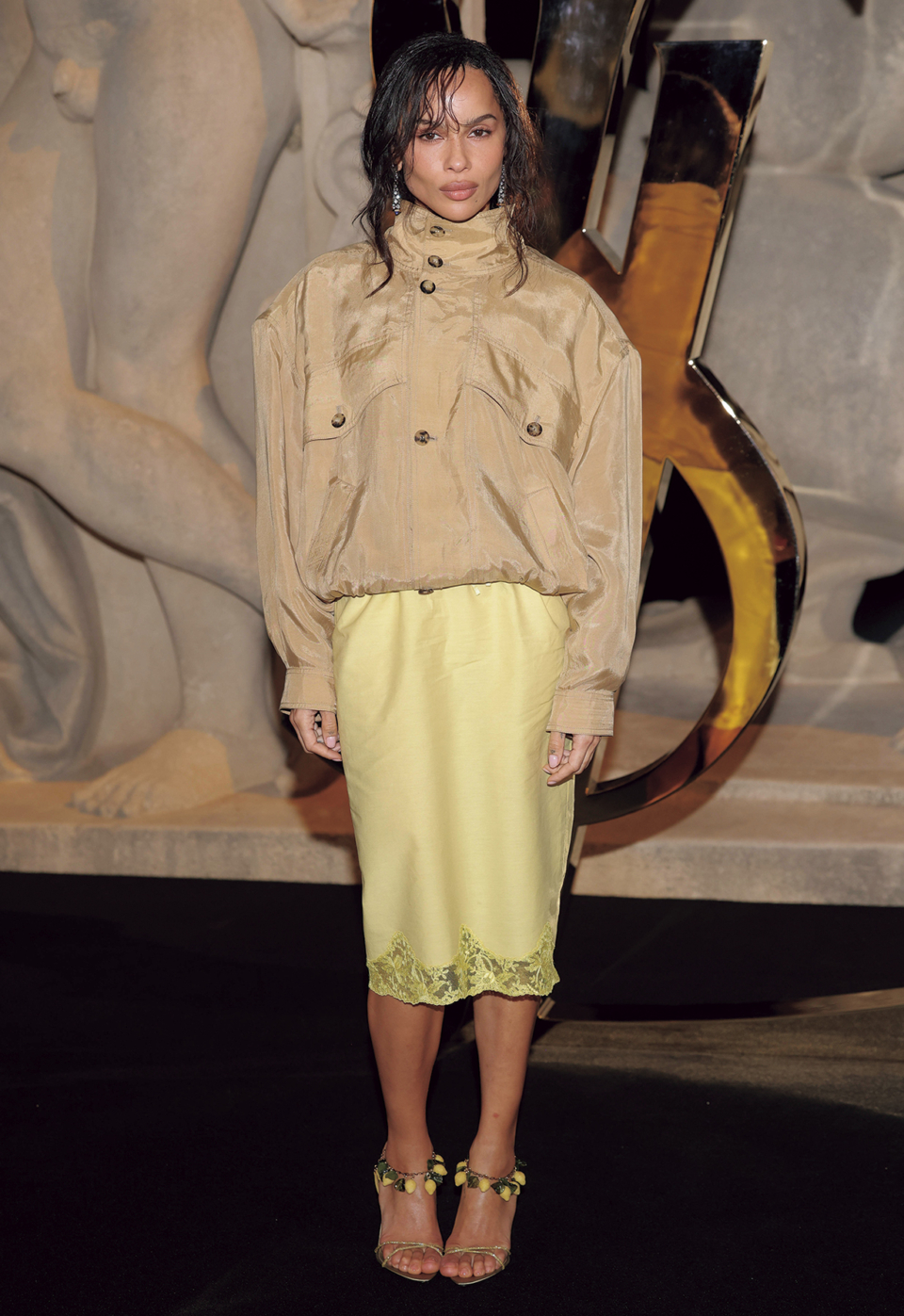 繊細なレースが主役のランジェリードレスをさらりと着こなすゾーイは、甘さを見せ方で引き算する名人。センシュアルなのに品よく、今シーズンらしいムードに着地する。