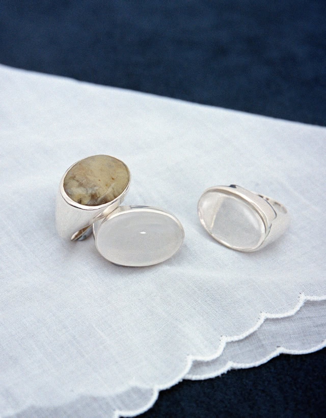 Recycle SV925に光を包むような球体フォルムの天然石を合わせたスフィアコレクションのモダンなリング。ひとつはもちろん、重ねづけすることで生まれる存在感は成熟した大人の手にこそ相応しい。