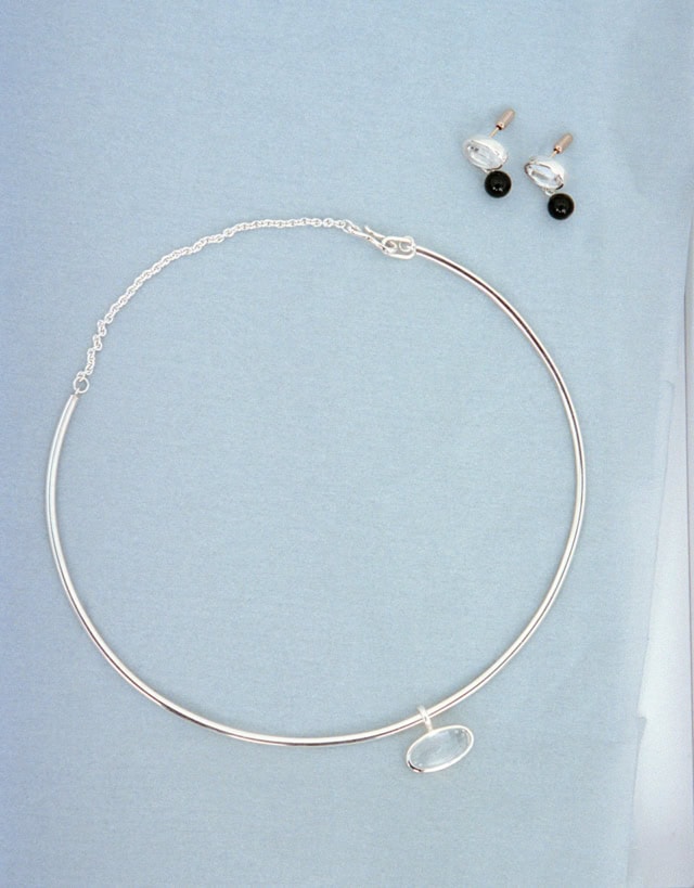 クリーンでくもりのない水晶が素肌の美しさを際立たせるネックカフとピアス。シャツやドレスにはもちろん、Tシャツの日にも清潔感と清涼感をさり気なく感じさせてくれる貴重な存在。