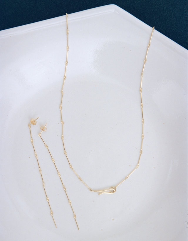 “スキニー(英語で瘦せ細った、の意味)”の名の通り、削ぎ落とされた極細のK18YGのパーツをライン状に連ねた、スタイリッシュなK18ジュエリーのシリーズ。本物のゴールドジュエリーを探しているけれど、デザインは現代的であってほしい。そう願う大人に熱烈に推薦したいのが、まさにスキニーコレクションです。