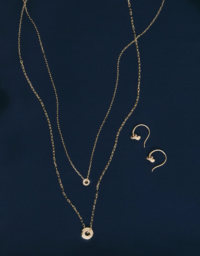 K18YG×ダイヤモンド。王道の組み合わせながら、エテ ビジューならではの“新しいベーシック”を追求した、大人のためのスキンジュエリーシリーズ。他とかぶらないパヴェダイヤのデザインを探している方にそっとこの存在を伝えたいヌーヴコレクション。愛らしいネックレスとピアスは、揃えてコーディネートで愛用したいものです。