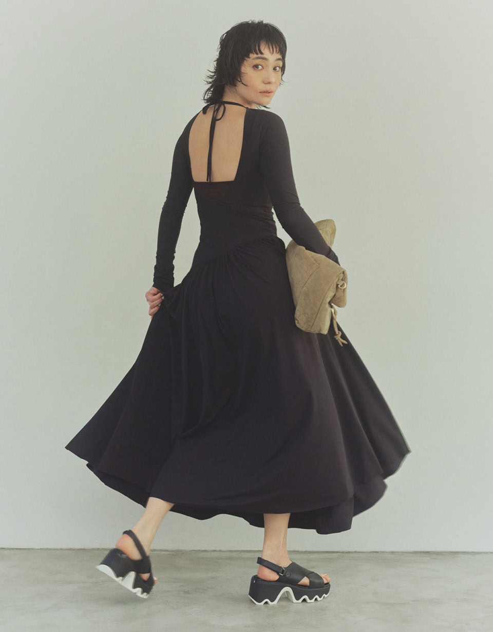 トップはタイト、スカートはフレアというメリハリのあるドラマティックなドレスに、【ソレル】のサンダルをプラス。どちらもブラックで揃えているので足元がより引き立ち、シャークソールのギザギザとしたデザインもホワイトの縁取りもモダンなアクセントになってくれます。さらにボリュームあるスカートとサンダルのおかげで、視覚的に足首をキュッと見せてくれるというのも嬉しいポイント。