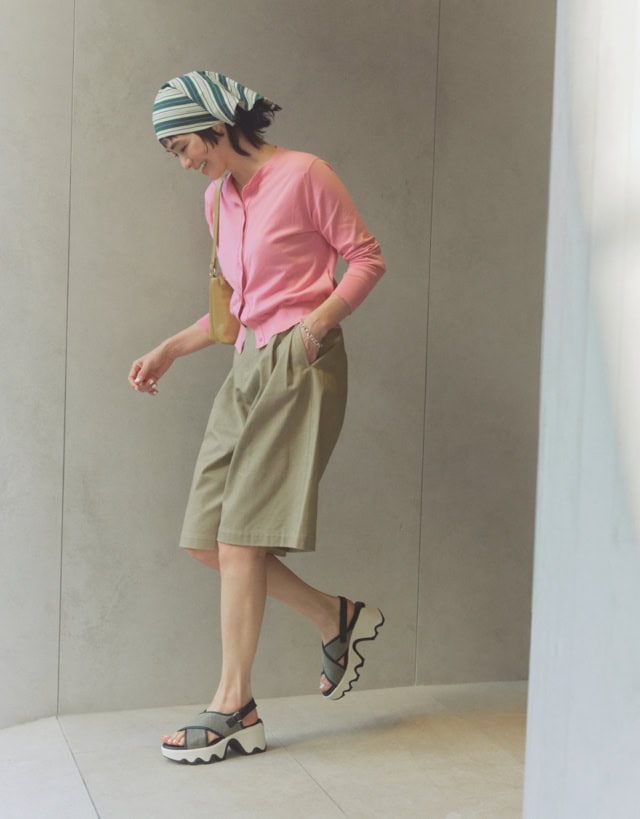 トレンドのキュロットパンツに合わせたのは、ラフィア風のテキスタイルを採用した1足。表情豊かな素材感も印象的で、ベージュ×ブラックの洗練された配色を引き立たせながら、より夏らしい足元を手に入れられます。トップスはピンクのカーディガンでコンパクトにまとめるのが気分。ボリュームのあるショーツ&サンダルとのコントラストで、今ドキのシルエットバランスを構築したところにも注目です。