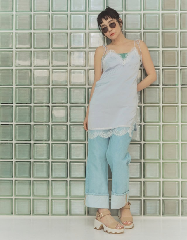 肌なじみのいいベージュのサンダルに、アイスブルーで揃えたレースキャミドレスとデニムをスタイリング。ワイストラップなので程よくヌーディで、それでいてボリューム感があるおかげでヘルシーな足元に仕上がります。サンダルのキャッチーな横顔をさらに強調させるべく、デニムの裾を大胆にロールアップしたのもポイント。チラッとのぞくストラップのメタルパーツも、スタイリングの絶妙なスパイスに。