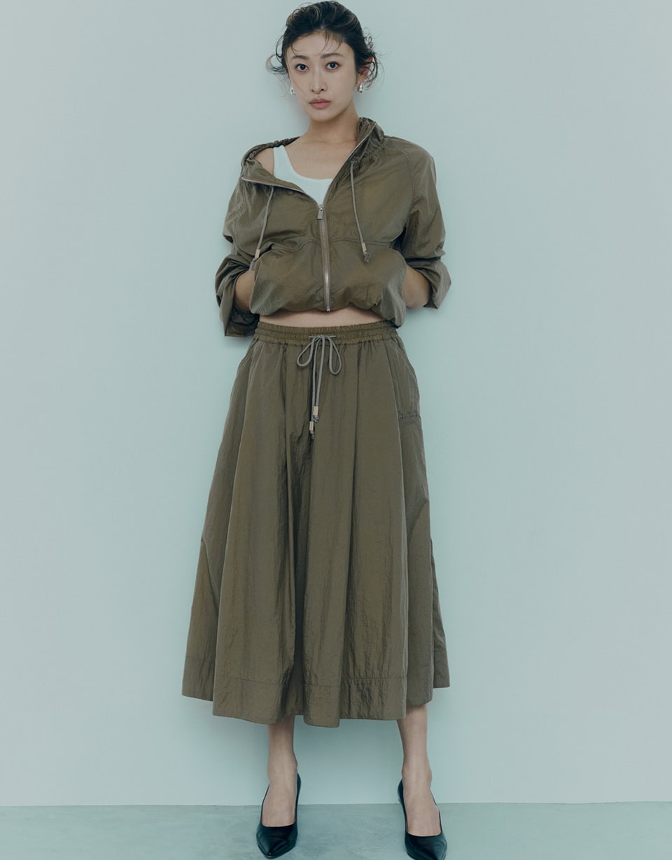 ブルゾンと同素材のミディ丈フレアスカートを合わせ、セットアップのように着るとエレガントで本当に可愛い! 中にタンクトップを着てチラッと肌を見せることで、ヌケ感も演出しています。スポーティな素材とレディな雰囲気のギャップ、そのバランスの取り方は大人の女性がブルゾンを着るときにオススメですし、すごく旬度の高いスタイリングに仕上がるはず