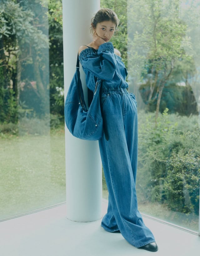 初登場のデニムアイテムの中で最も目をひくのは、華やかなオーラを放つオフショルダーのオールインワン。タトラスらしい上品で存在感が魅力のこちらは、8.5オンスの薄手デニムに洗いと色落ち加工を施し、軽やかでこなれた表情を演出。コンパクトなトップスとワイドストレートなパンツを組み合わせたバランスで、自然とスタイルアップを叶えてくれるシルエットなのも嬉しい。