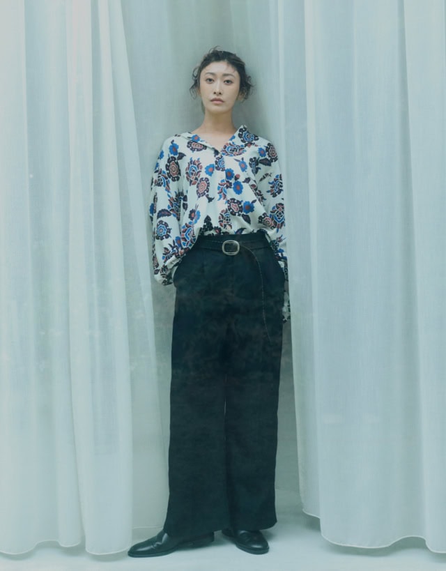 ゆとりあるシルエット、中肉厚でしっかりとしたコシのある生地で、リラックス感と上品さを兼ね備えたプリントシャツは、太めのワイドストレートパンツやレザーのスリッポンなど、メンズライクなアイテムを合わせてマニッシュに。胸元のボタンをたっぷり開けてヘルシーにかっこよく、そんな肩の力が抜けたハンサムな着こなし方って、大人の女性の余裕を感じて素敵だなと思います