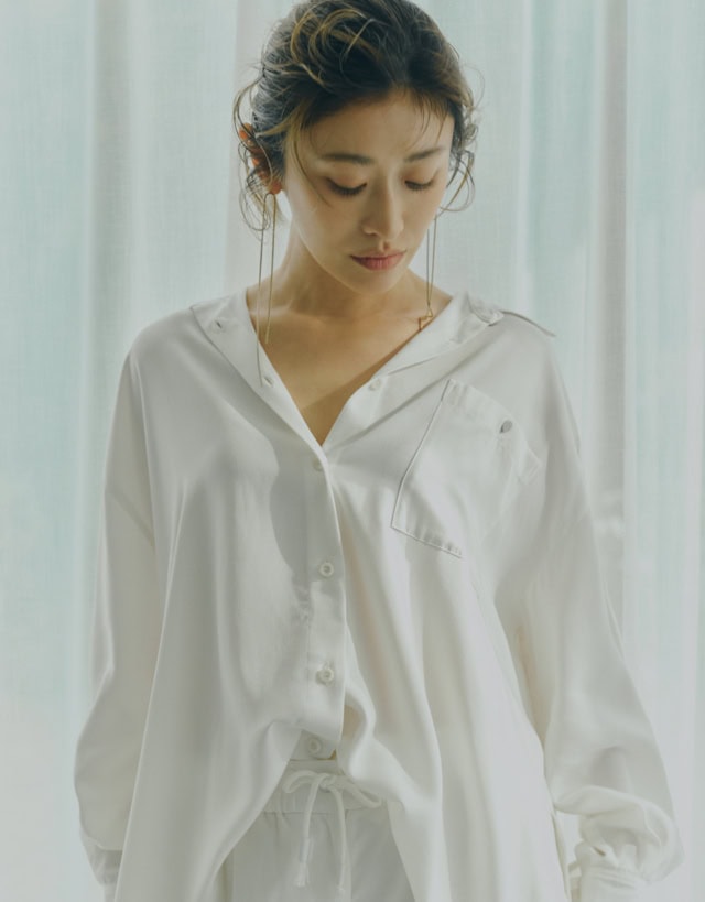 リラックスサイズのシャツとワイドパンツのセットアップは、とろみのある質感の上品さも相まって、衿を抜いてサラッと着るだけで、なんだかサマになります。繊細なピアスやヒールを合わせればお仕事でも対応できるきちんと感に仕上がるし、パンツのウエストが内ゴム仕様のドローコードデザインなので、シャツの前だけインしてサンダルをはいたら、リラックスしたリゾートウェアに