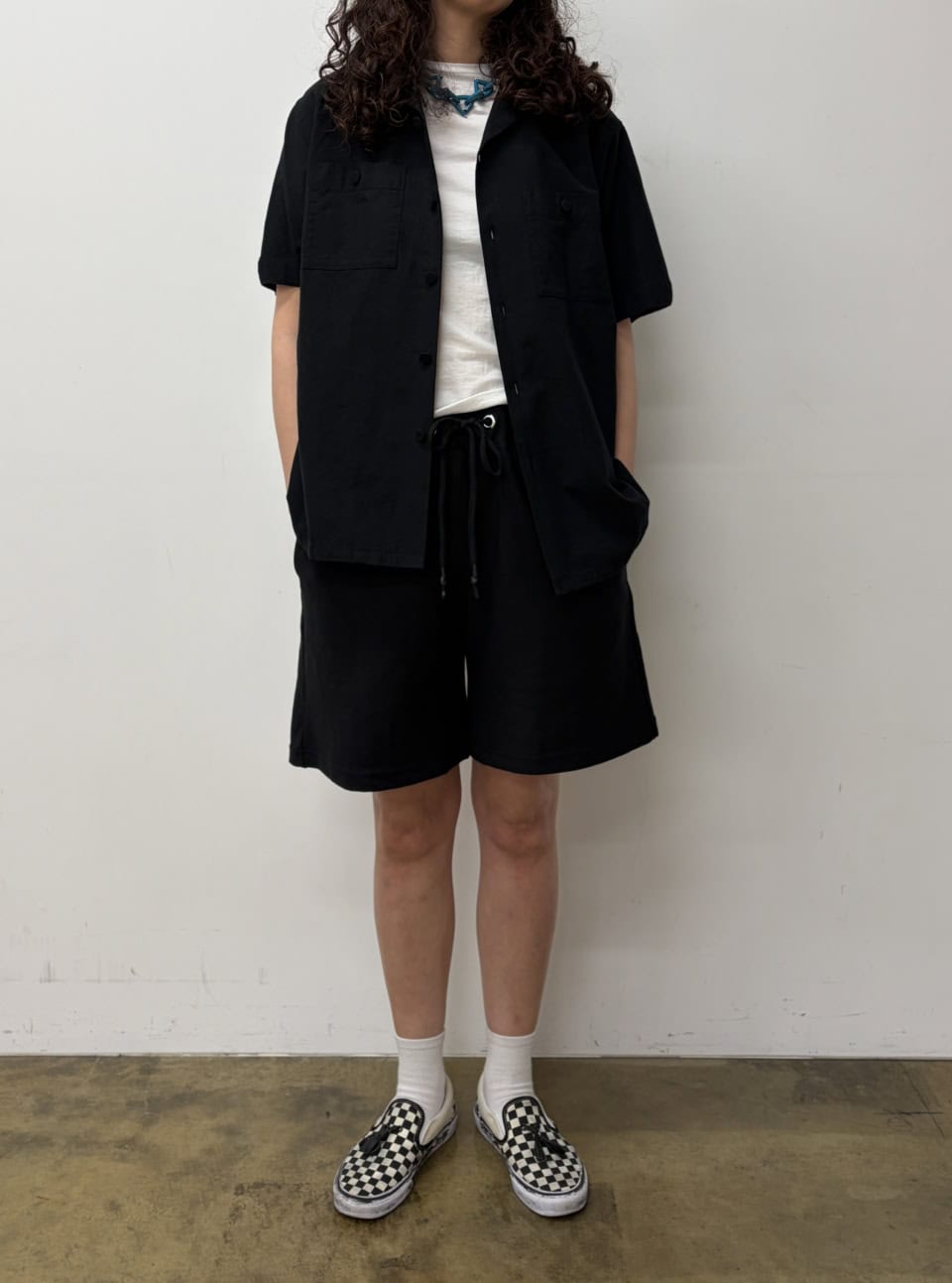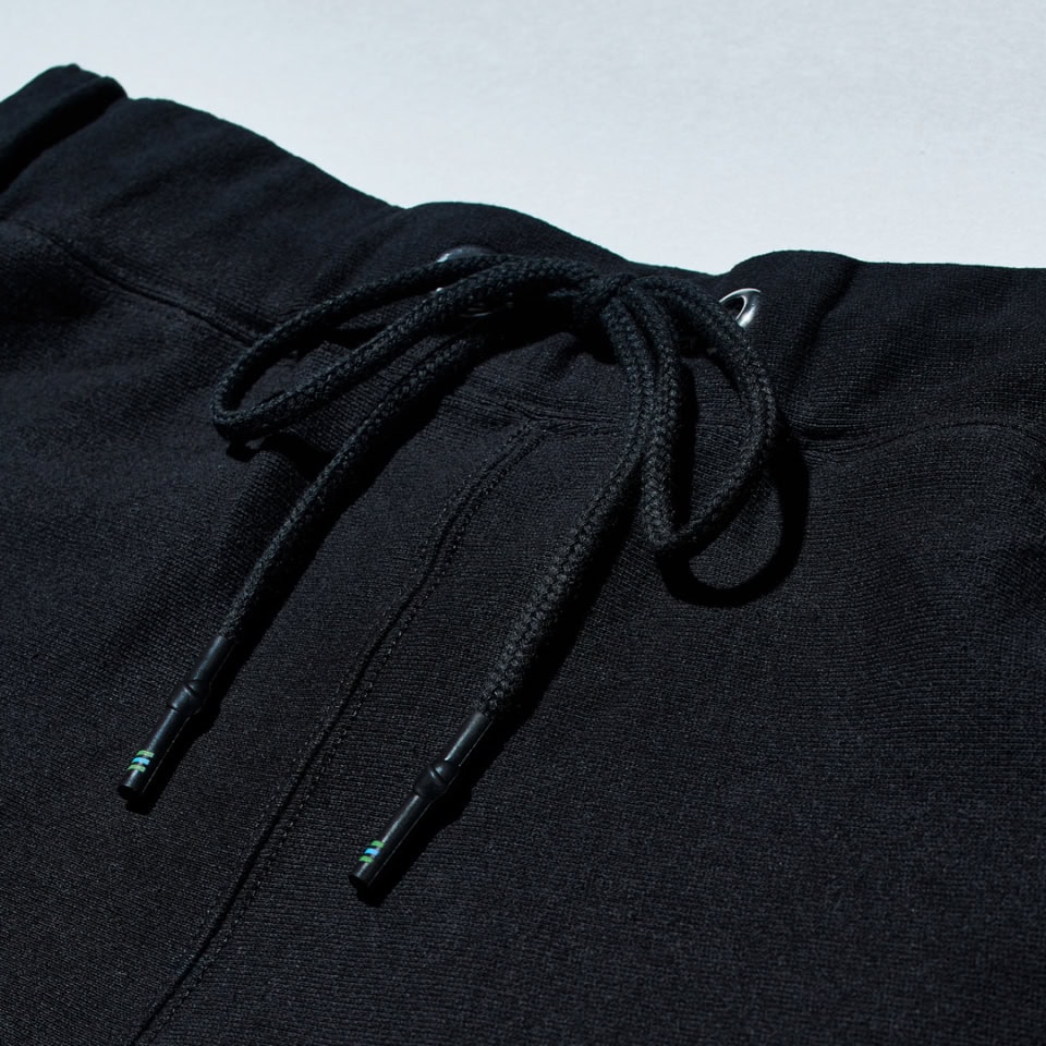 スエットショートパンツって、家着との差別化が難しいですよね。個人的にはその簡単な解決策は「丈感」だと思うんですが、【コンビニエンスウェア】は絶妙でした。174cmの筆者が腰ではいて、ちょうどひざ上になる丈感だったのですが、ソックスともバランスが取りやすい! あと黒ってのもポイントで、ライトカラーに比べると家着感が薄まる気がします。