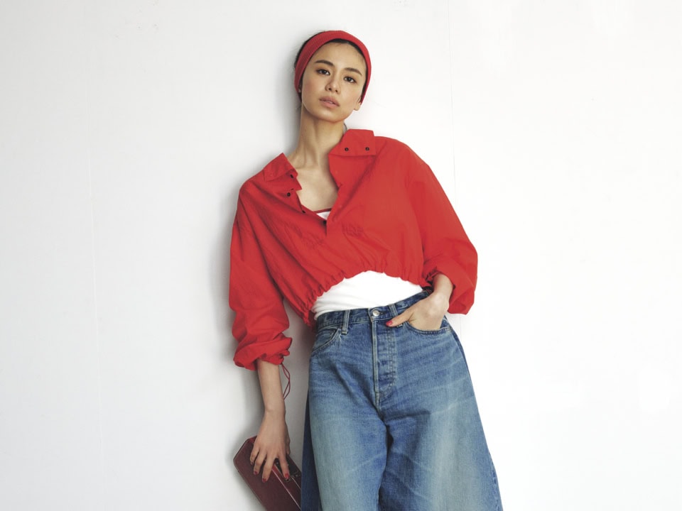 アノラックブルゾン¥30,900(イウエン マトフ/ユナイテッドアローズ 渋谷スクランブルスクエア店)、中に着たボディスーツ¥16,500、ヘッドバンド¥3,300(共にTW)、デニムパンツ¥57,200(ハイク/ボウルズ)、バッグ¥357,500、サンダル¥156,200(共にジャンヴィト ロッシ/ジャンヴィト ロッシ ジャパン)、ソックス¥5,500(バウム・ウンド・ヘルガーデン/S&T)