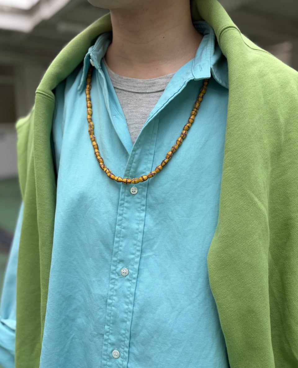巧みな色づかいでキャッチーなシャツスタイルを披露してくれた石黒さん。「最近はおしゃれすぎない、絶妙なダサさを入れた着こなしを意識しています。たとえば、洗練された着こなしでもスキを作るというか。それがバランスをとる上で一番気にしているポイントになります。今回は鮮やかなシャツをセレクトしましたが、だいたい第1ボタンだけ開けてシュッと着こなすと思うんです。でもボタン2つ開けで古着のグレーTシャツをのぞかせる。杢調のグレーなので絶妙に野暮ったいんですよね。それが今の気分です」