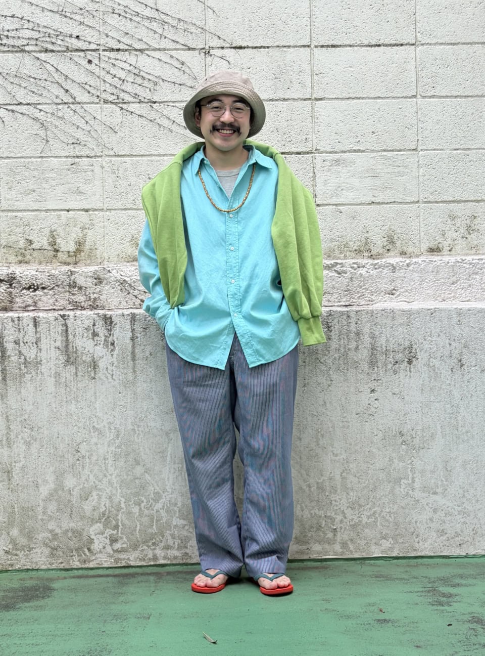 さらに気になるのが足元。なんと石黒さんは、ほぼ1年中ビーチサンダルをはいているそう。「メンズは革靴で着こなしを整えることがよくありますが、その対極にあるのがスニーカーです。スニーカーだとカジュアルなんだけど、ビーサンまで行くともはや軽すぎてポップに振り切れる。あと、例えばここにヴァンズを合わせると、こういう計算でここにヴァンズなんだな、というのがわかってしまう。でもビーサンまでいっちゃうと、なんでそれを選んだかの詳細というか思考も追えなくなる。それがイイんです(笑)」