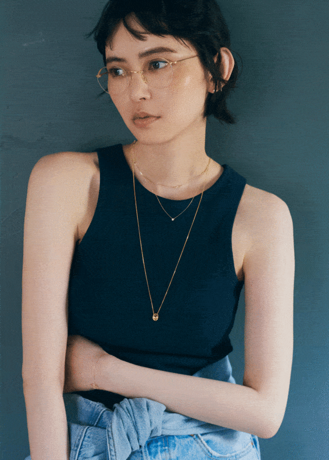 タンクトップ¥9,350(エイチ ビューティ&ユース)、デニムパンツ¥17,600、腰に巻いたデニムジャケット¥14,300(共にリーバイス®/リーバイ・ストラウス ジャパン)、ピアス[K18YG×ダイヤモンド]¥330,000(ヴァンドーム青山/ヴァンドーム青山本店)、イヤーカフ[SV925×GP]¥6,050(ハイク/ボウルズ)、眼鏡¥60,500(アヤメ)
