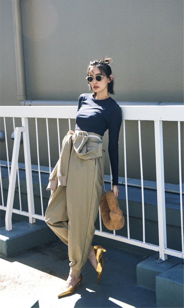 ラッシュガードを着るのはビーチだけ、なんてそんなの完全に遠い昔のお話です。速乾性という嬉しい機能、まだまだ暑さの残る初秋のシティでこそ、生きるってもの。ハイウエストボトムと好相性のショート丈なら、ウエストまわりのもたつきとも無縁。トップス部分を高め位置でキュッと結んだジャンプスーツと、こんな感じで♡