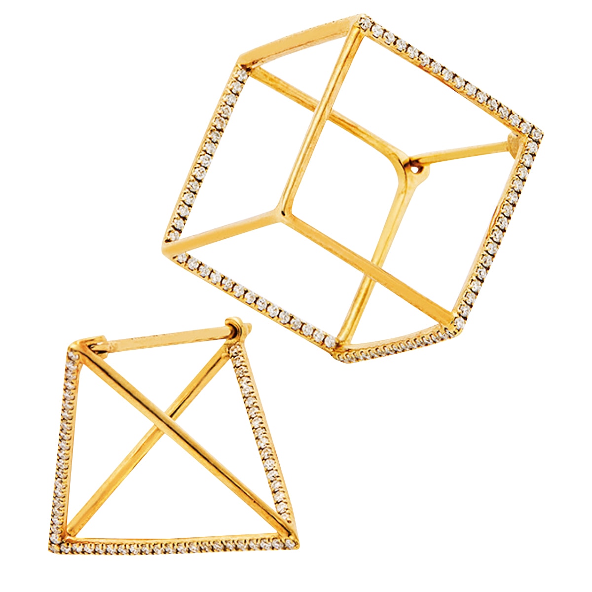 立体的なモチーフで、耳元をモードに彩ってくれます。スクエアピアス[K18YG×DIA]¥176,000、トライアングルピアス[K18YG×DIA]¥121,000(共にシハラ/シハラ ラボ)