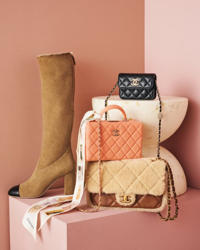 右上から時計回りに:チェーン付きクラッチ[H9.5×W12.5×D3.5㎝]¥435,600、バッグ[H12.5×W18×D6.5㎝]¥1,037,300、バッグ[H16×W23.5×D7.5㎝]¥1,053,800、スカーフ¥57,200、ブーツ[ヒール9㎝]¥418,000(全てシャネル)