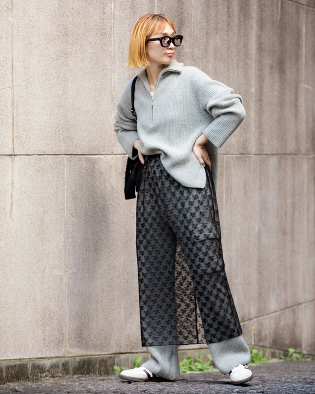 「ニットのセットアップが単調に見えないようにレーススカートをレイヤード。ざっくりとしたニットと繊細なレースという相反するテイストの組み合わせでこなれ感を意識しました。ナイロンバッグとボルドーの3ストライプがきいたエミ別注のSAMBA OGを合わせて、さり気なくスポーティさをプラスしています」(木下沙理菜さん)
