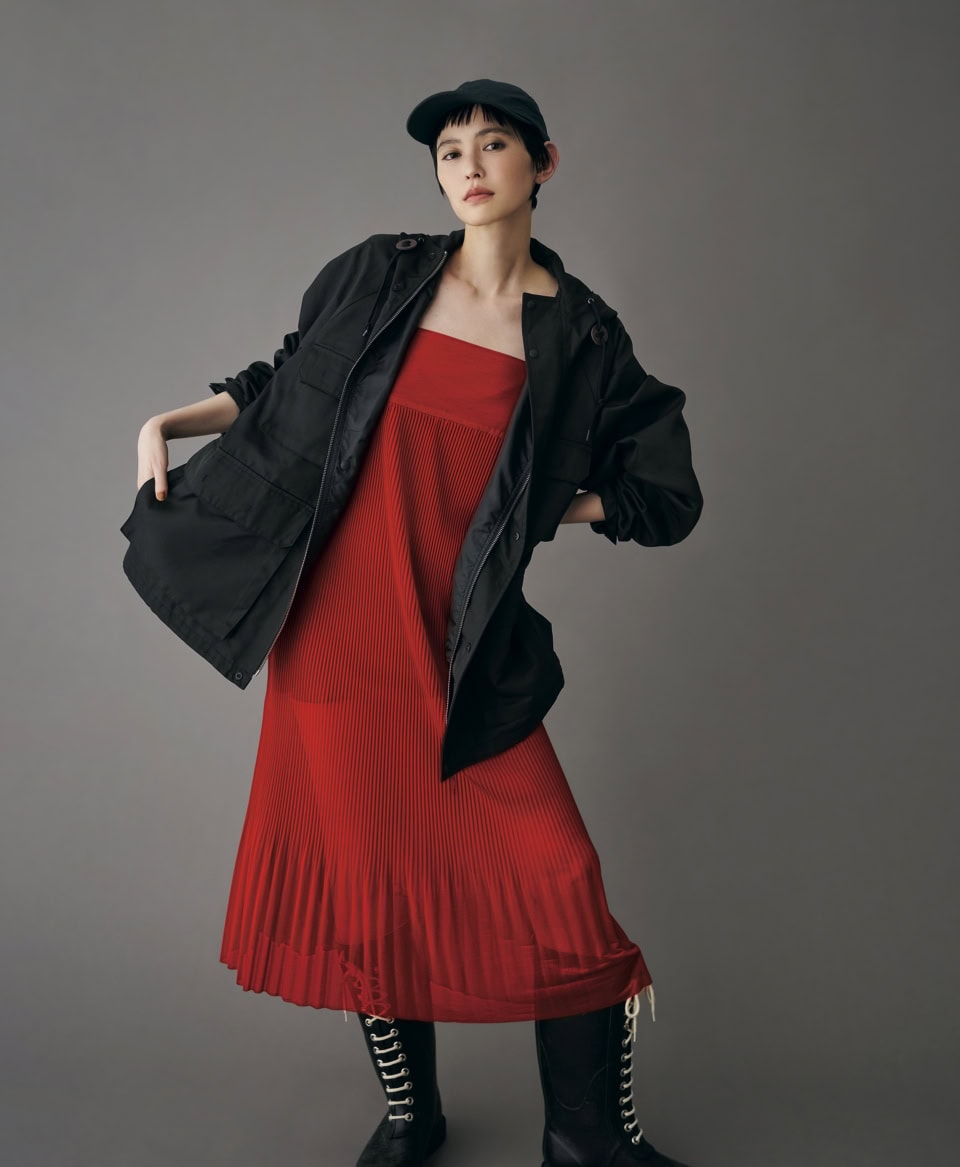 ジャケット¥13,200(コールマン/コールマン カスタマーサービス)、ドレス¥30,800(ハイク/ボウルズ)、キャップ¥12,100(アンデコレイテッド)、ブーツ¥28,600(ILSE JACOBSEN/メイデンカンパニー)