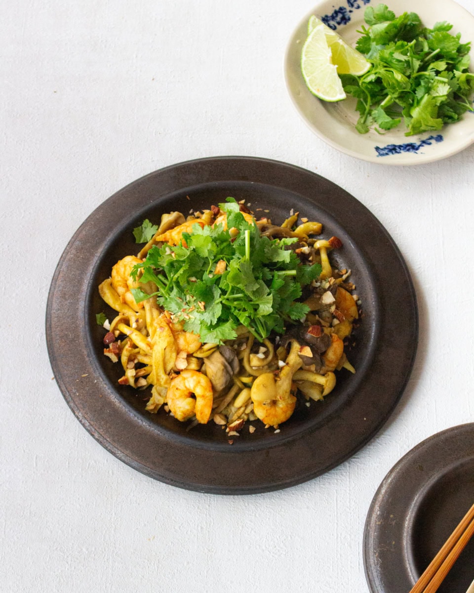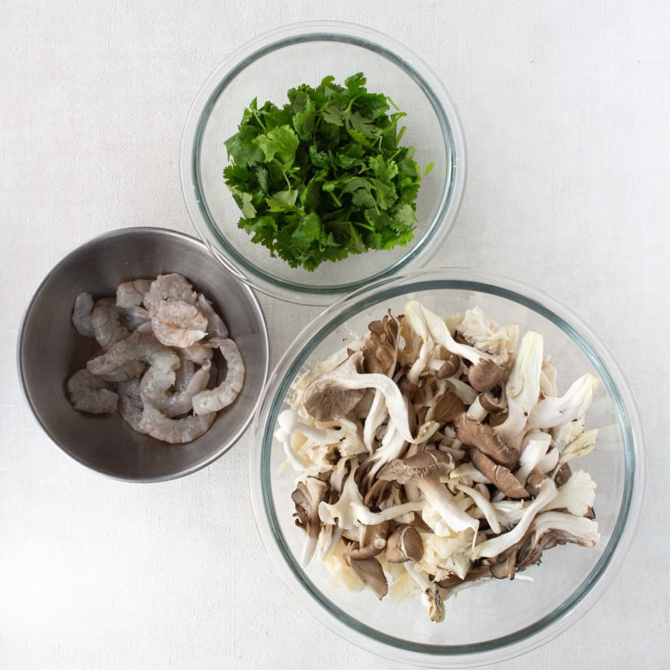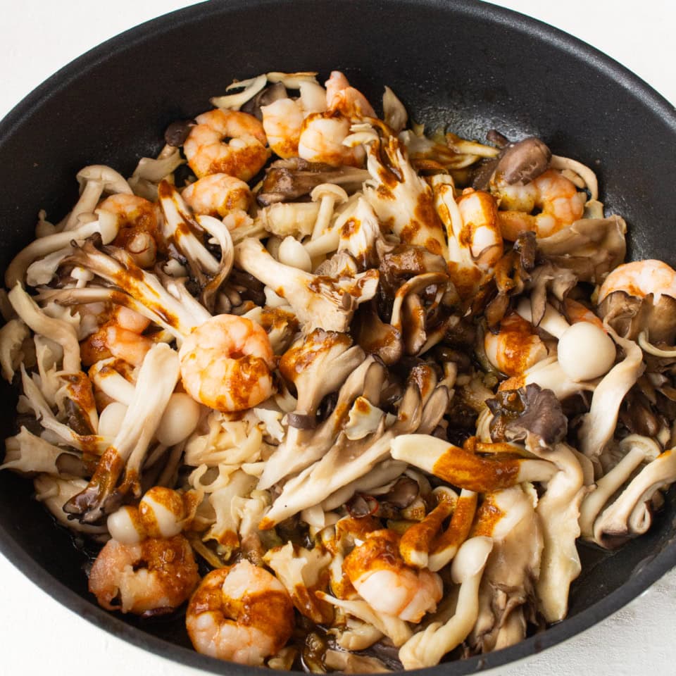 1.きのこは小房にわけ、えびは片栗粉、塩少々(分量外)で洗い、水気を切る。ナンプラーとカレー粉は混ぜ合わせておく。