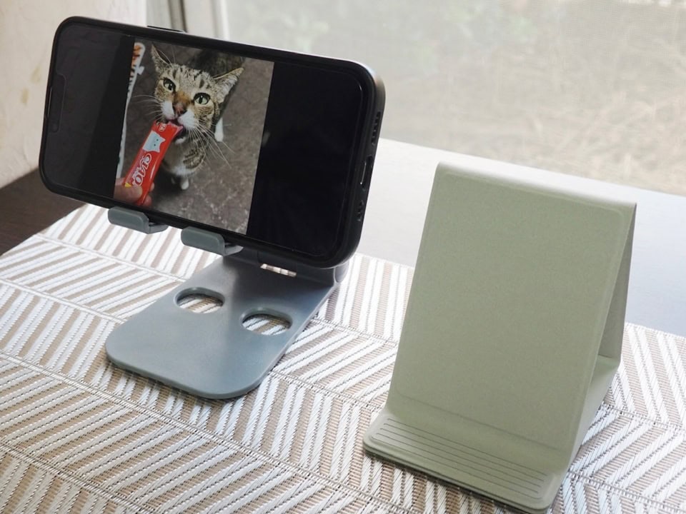 スマホスタンドは2台使い。左:ダイソー、右:無印良品