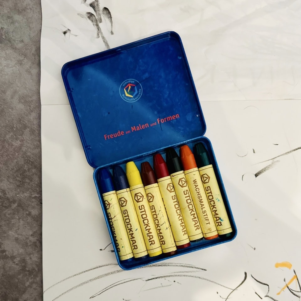 さて、最後に、最近買ったアイテムを。蜜蝋のクレヨン。ドイツのブランド「Stockmar」のもの。柔らかくて発色がよく、赤ちゃんが口に入れても安全。1歳ギャルズの前で開封してたら、きらきらのまなざしで。目の前に置いたら、すぐにひとりはトントントンと画用紙に点を打って、もひとりは、クレヨンをさかさまに持ち、左右に線を引きました。なんだろと思い、興味を持ち、使い方や表現はさまざまだけれども、やってみたい! という純粋な行動に、パワフルさを感じた瞬間でした。