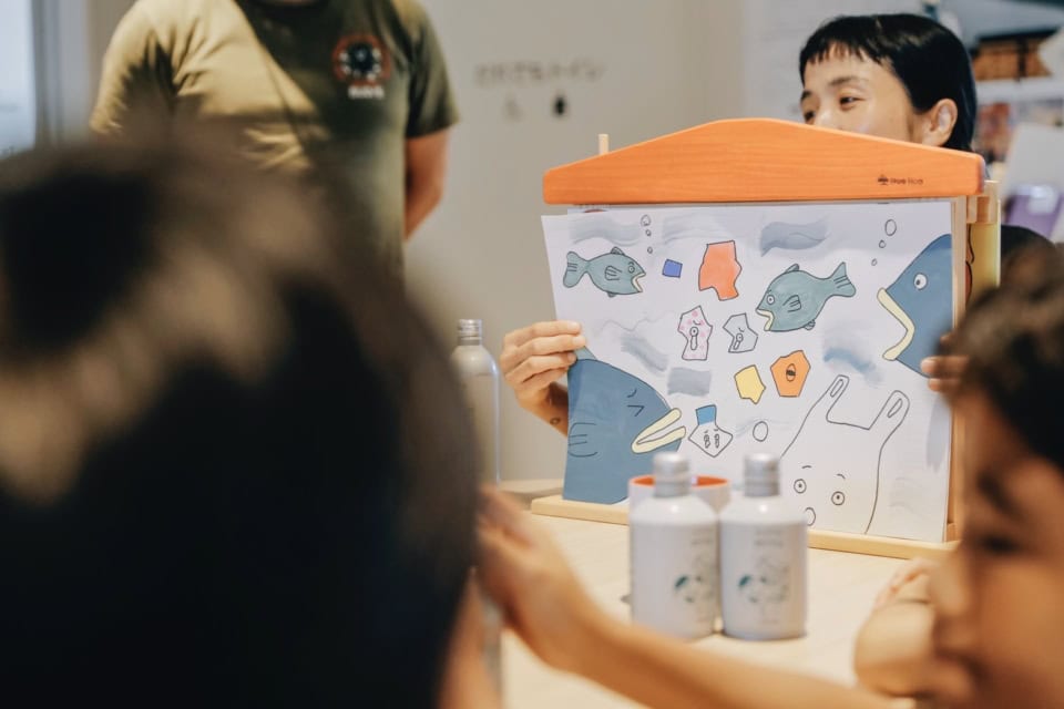 スタートはチーム【レインボー】で作った、ペットボトルをテーマにした紙しばいを読みます。これ、実はChatGPTに相談しながらストーリーを考えたもの。小さな子どもたちにも伝わりやすいように、「ペットボトル君の旅」という趣旨でお話を構成しました。子どもたちが日常で何気なく購入しているペットボトルがどうなるのかについて理解した後は、河合さんが作ってきてくれたクイズに挑戦! みんなでワイワイ盛り上がりながら答えを考えました。