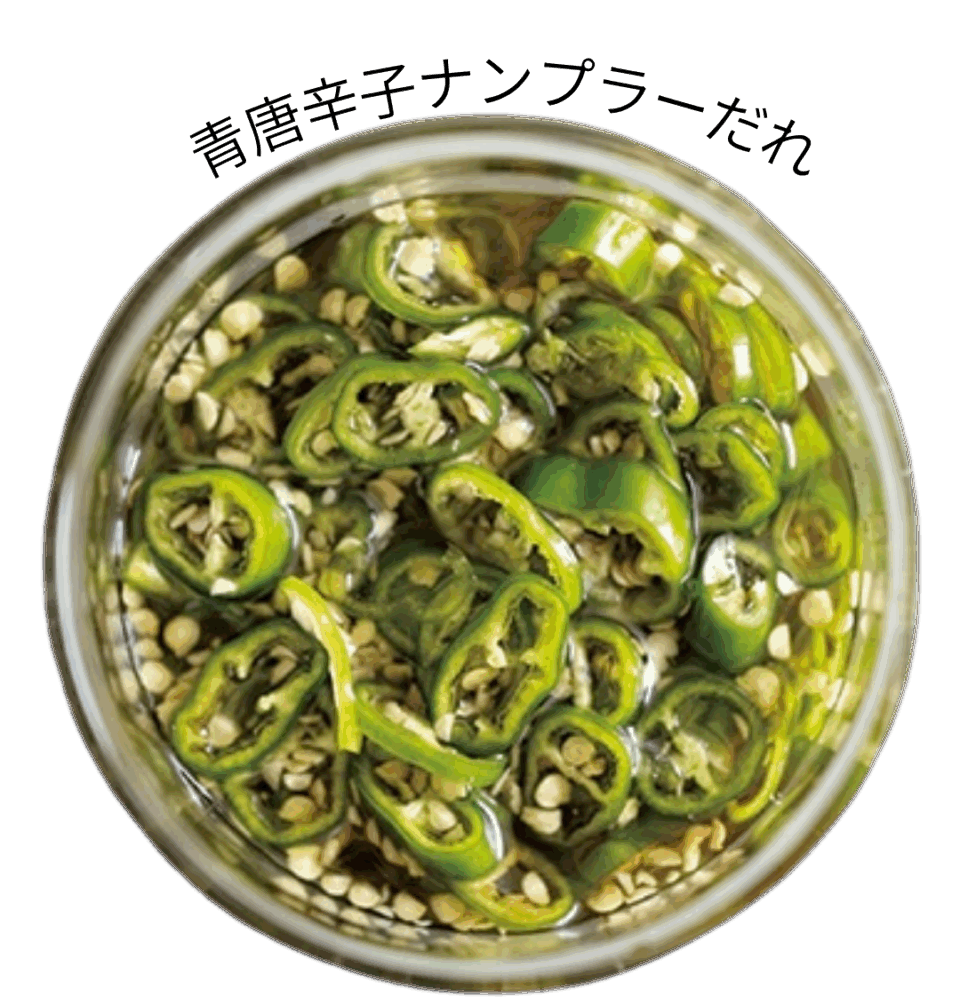 “青唐辛子ナンプラーだれ”は、卵かけごはん、豚バラ肉と玉ねぎの炒めものにもオススメ!