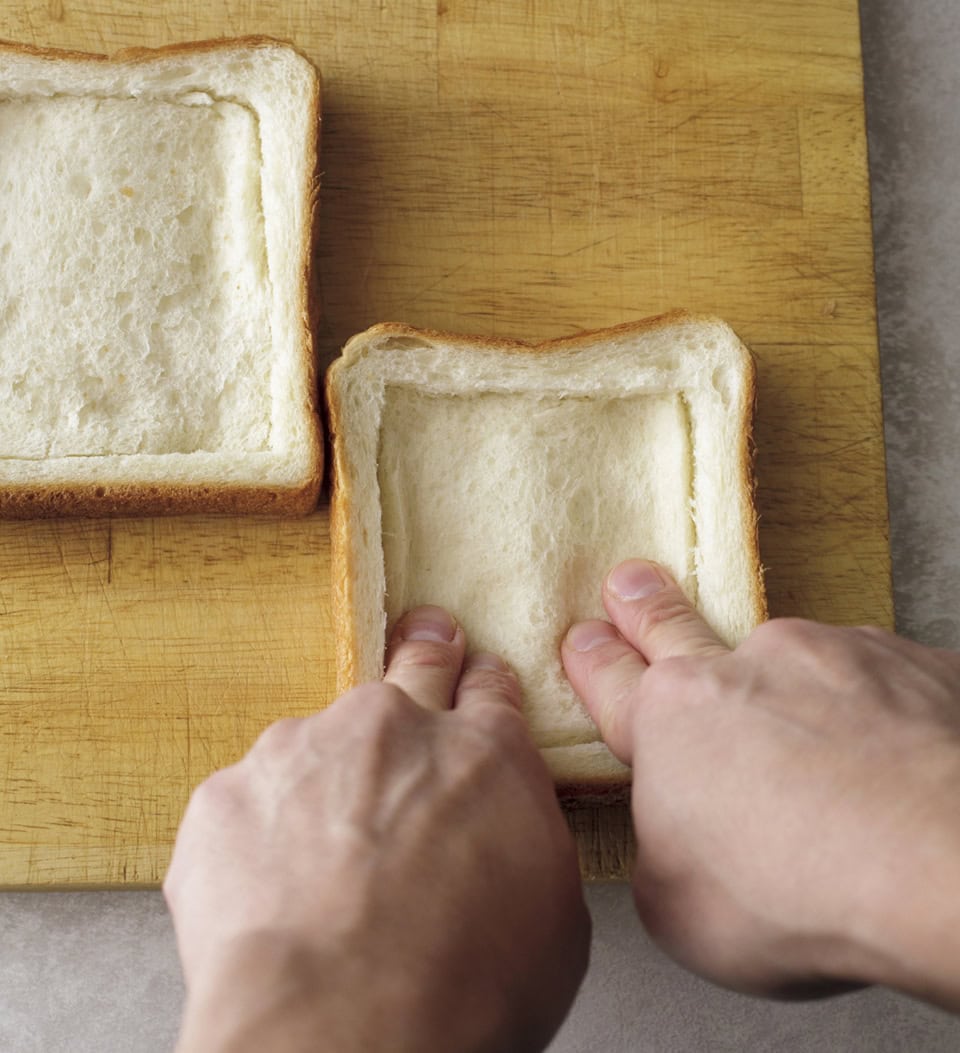 ①食パンは端(耳側)から5㎜ほど内側に、厚みの半分くらいまで切り込みを4辺入れる。食パンを指で押し込み、ヘコませる。