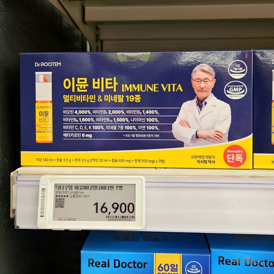 スーパーマーケットのHOMEPLUSで発見したのは。Dr.ROOTEMのイミュンビタ。7本入りで16,900ウォン(日本円で約1,859円)なので、1本あたり265円くらいということですね。