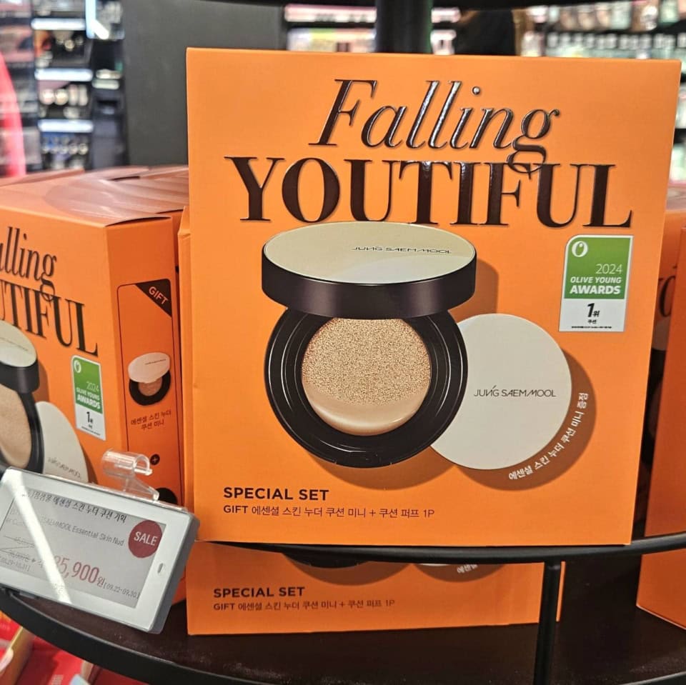 私、ここ1年ちょっとジョンセンムルのエッセンシャル スキン ヌーダーというクッションファンデを強烈に愛用していて、周囲に「どこのファンデ使ってるの?」と聞かれた際はご紹介しているのですが、こちらのプロモーションキットを発見。実商品+ミニサイズのクッションファンデがセットでプロモーション価格の35,900ウォン(日本円で約3,949円)。日本だと実商品だけで4,000円ちょっとで売られていますから、これはおトク!