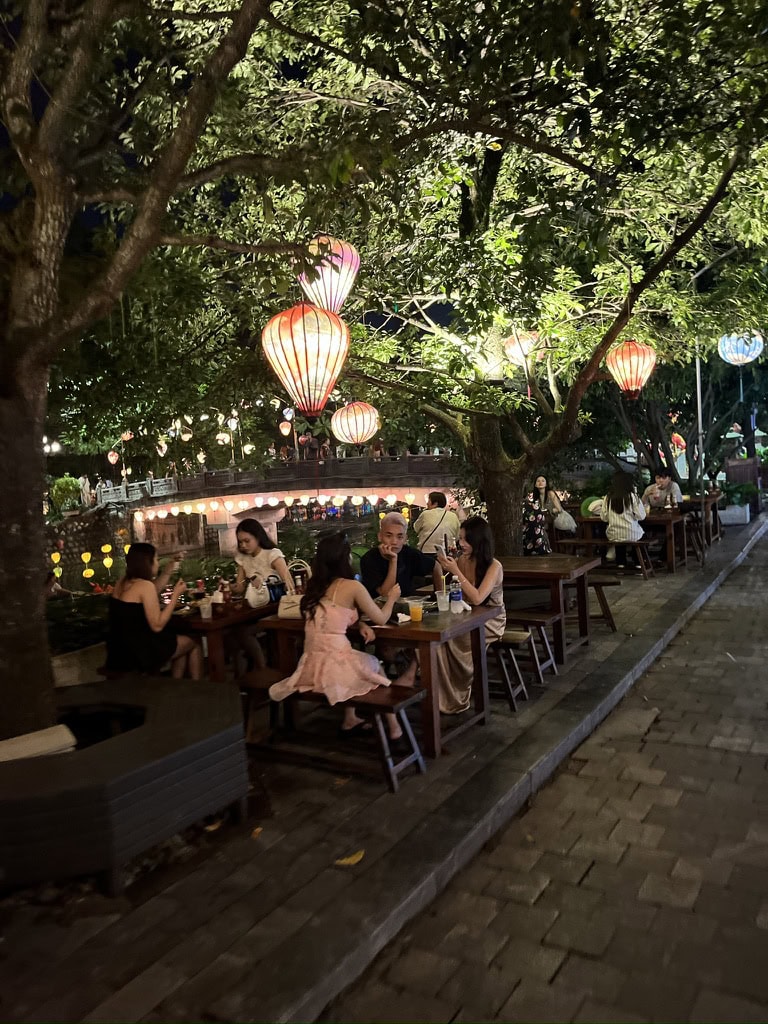 ランタンが灯された川沿いで食事を楽しめるのも、「ホアルー古都ナイトマーケット」ならでは