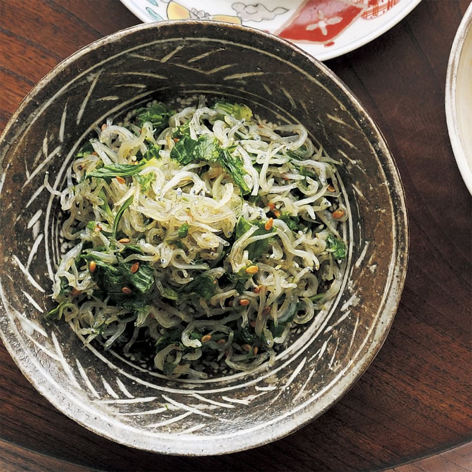 ②鍋にごま油を熱し、ちりめんじゃこを入れて炒め、香りが出たら❶を加えて炒める。酒を振り入れ、水分がなくなるまで炒める。葉の色があざやかになったら、白ごまを加えて混ぜ、塩で味を調え火を止める。