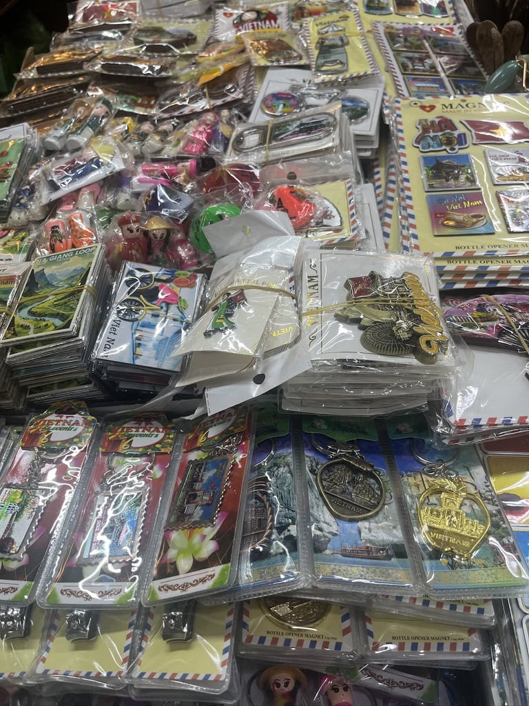 空港にも売ってそうなキーホルダー系も売ってます。刺繍ポーチもそうなんですが、こういったベトナム定番のおみやげは空港で買うより安いので、欲しい人は市場で買うのが正解です