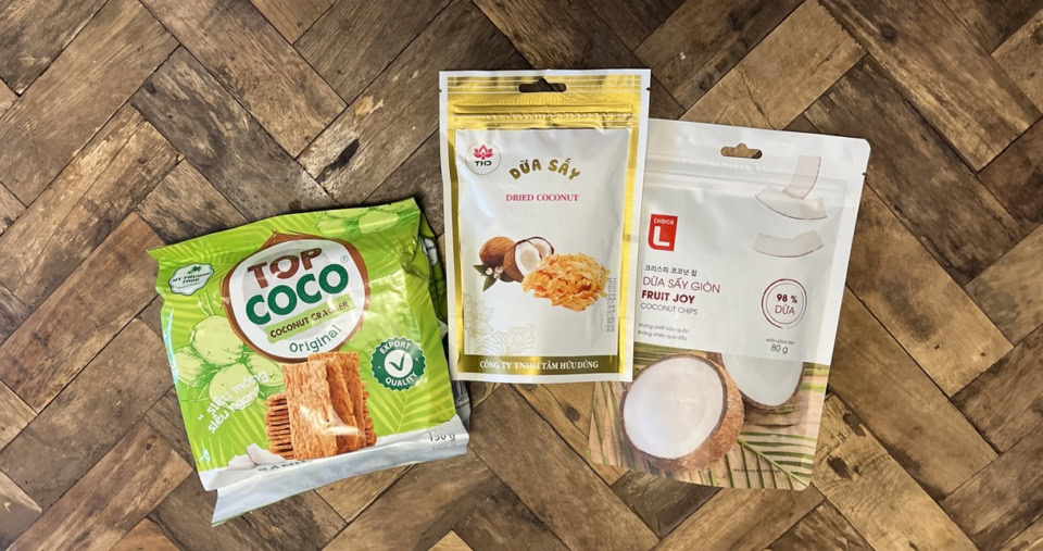 今回初挑戦だったココナッツチップ。じつはココナッツが少し苦手で、これまではノー眼中だったんです。でも、一緒に旅をした方たちがオススメしてくれたので、3種類ほど買ってみました。左はココナッツクラッカー(31,100ドン=日本円で約186円)で、めちゃくちゃおいしかったです。小分けになっているのもよかったし、もうひとつ買えばよかったと後悔したほど。真ん中(15,800ドン=日本円で約94円)と左(23,900ドン=日本円で約143円)はココナッツチップで、どちらも軽くてパクパク食べられちゃいます。バニラアイスの上にトッピングしても、これまた絶品!