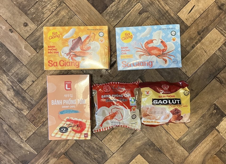 まずご紹介したいのが、東南アジア料理の脇役的な位置付けでお皿に盛り付けられているえびせんです。筆者はお酒のアテにしているのですが、これが本当においしい! 今回は母にも頼まれたので、いろいろな種類を購入してみました。袋モノで6,900ドン(日本円で約41円)、箱モノで20,000ドン前後(日本円で約120円)と、今回もびっくりするほど安かったです!