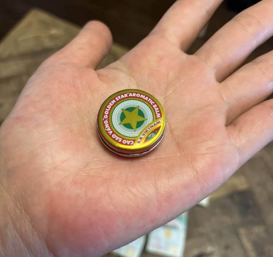 これまた旅を共にした方にオススメしてもらった「Cao Sao Vang」(ゴールデンスターバームとも呼ばれているそう」。筆者は【ロッテセンター ハノイ】の地下にある薬局で見つけたのですが、いわゆるベトナム版のメンソレータムです。どうやらタイガーバームを参考にしているそうですが、シナモンも含まれているか、日本人が慣れ親しんだメンソレータムとは一味違うベトナムらしさを感じる香りを楽しめます。